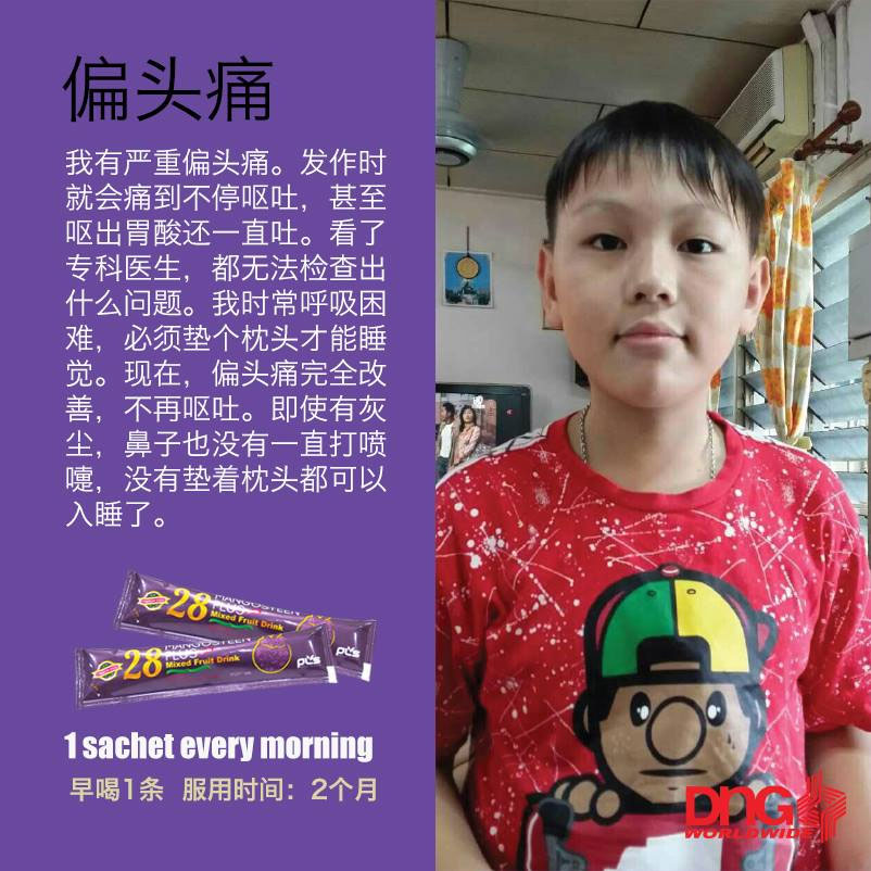 偏头痛发作时会让我呕吐,我还经常感觉呼吸困难,无法好 好入睡。28 Mangosteen Plus是我的救星,偏头痛没了,睡眠品质也改善了!