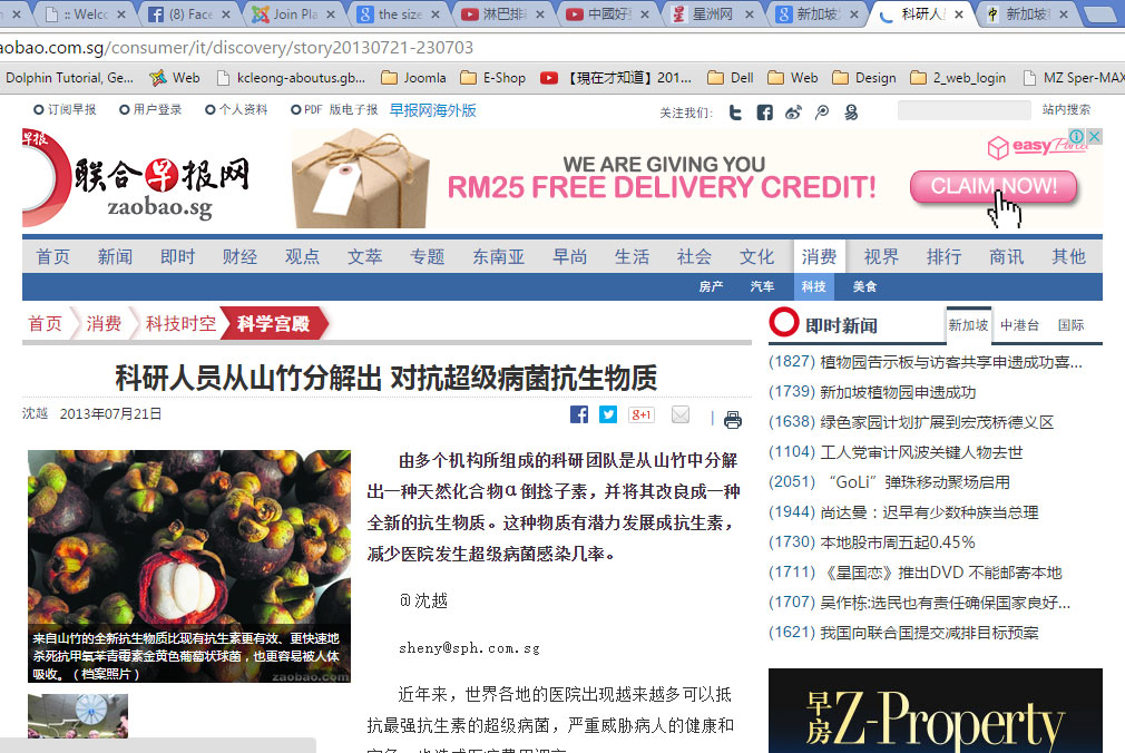 一群本地研究人员成功从热带水果山竹中分解出一种天然化合物α倒捻子素(alpha-mangostin),并将其改良成为一种全新的抗生物质。这种物质有潜力发展成抗生素,减少医院发生超级病菌感染的几率。